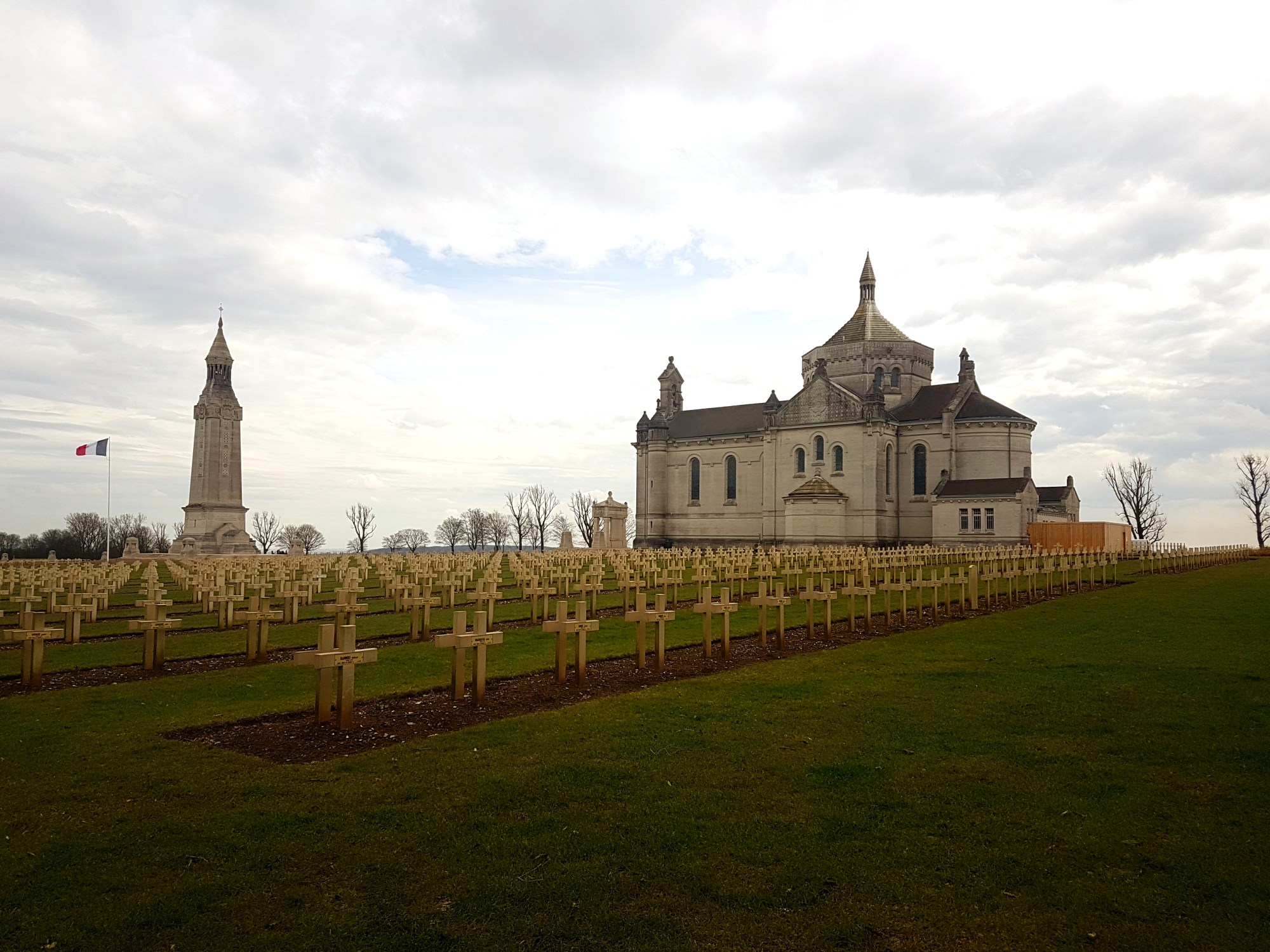 Approximately one hour later, and after a minor detour through the village of Souchez, we meandered along the rather grand approach to Notre Dame de Lorette National Cemetery. This is the largest French war cemetery where 40,000 soldiers have been laid to rest; 22,000 of these are unidentified and buried together in mass graves. The white stone basilica stands in the centre of the cemetery with the lantern tower opposite. Across the road, and next to a viewing platform from which you can look across the “front” towards Vimy Ridge, stands the Ring of Remembrance where the names of all 580,000 soldiers who died are listed irrespective of rank of nationality. It was incredibly moving and eye-opening to see the sheer quantity of men who lost their lives at this location.